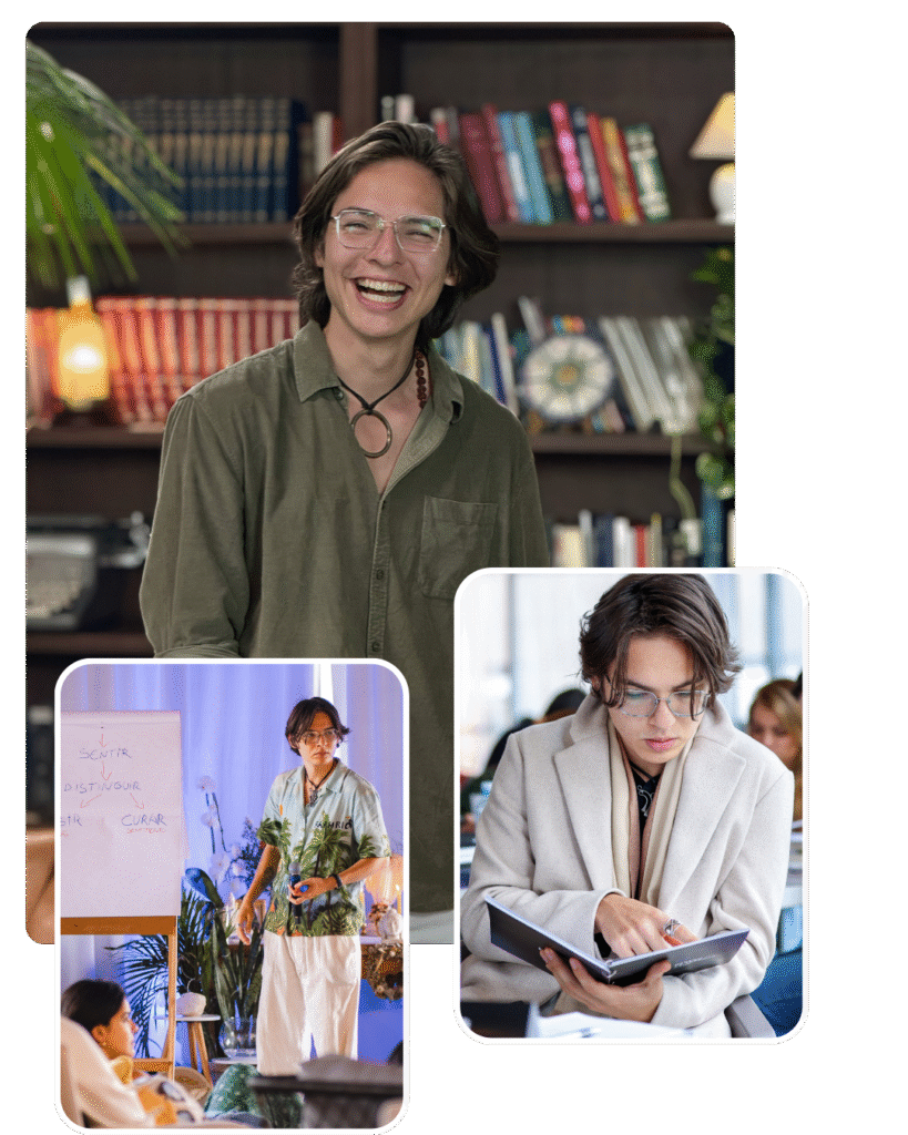 Desde os 12 anos mergulho no estudo do autoconhecimento, experimentando novas formas de aprender, ensinar e viver. Aos 23, já acumulo mais de nove anos de experiência em palco e, há quatro anos, facilito workshops e treinamentos inspirados pelo Possibility Management.